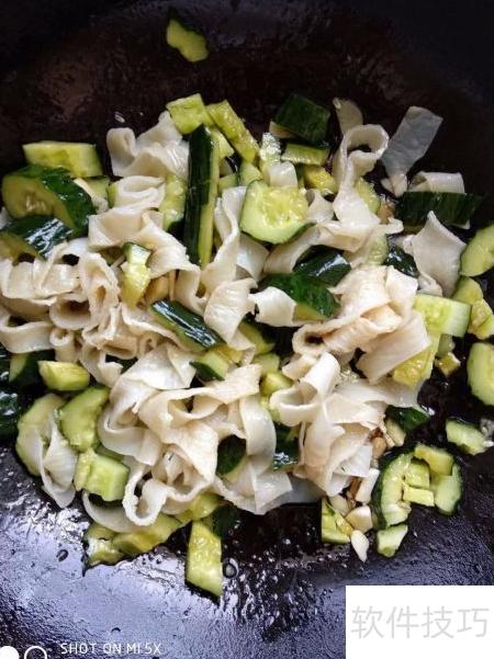- 待油温稍降,倒入备好的黄瓜、面皮与蒜泥,加盐和香油拌匀即可享用。