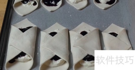 - 将两个角轻轻捏合,置于烤盘,烘烤前表面刷一层牛奶即可。