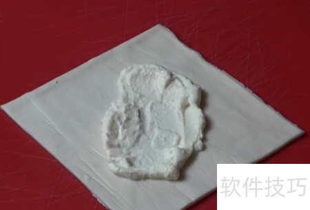 将小正方形面皮放在案板上,一面朝向自己,中间放满清干的乳酪,并均匀涂抹,最后放上切好的蓝莓即可。