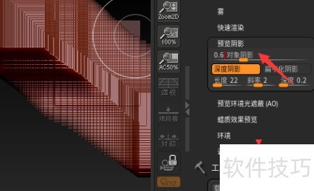 在ZBrush 2021.6.2中,将对象阴影设为0.6的方法如下:进入显示面板,找到阴影强度选项,将其数值调整为0.6即可完成设置。
