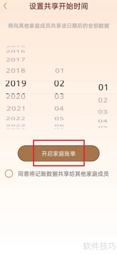- 在设置共享起始时间页面,点击开启家庭账单即可完成操作。