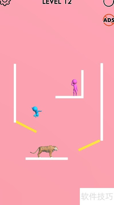 蓝色角色站于右侧上角,粉色角色立于平台上,下方是老虎,关卡里装有滑轮机制,结构详览图所示。