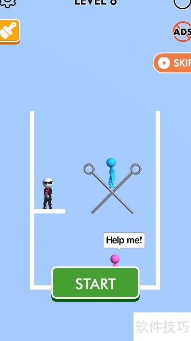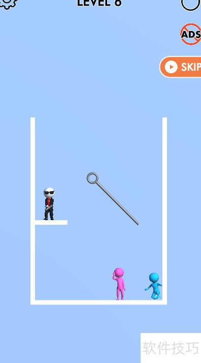 关卡设计有两道斜向插销,小粉人在右下请求帮助,小蓝人正站在它的上方。