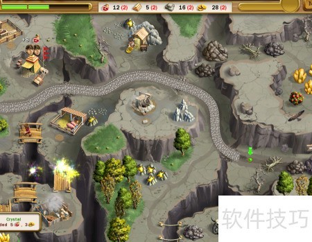 - 建造上方金矿与左下仓库,派遣工人采集左下黄色水晶并修复右侧道路。