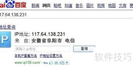 - 将IP地址复制到百度搜索,结果页面会直接显示该IP的归属地信息。