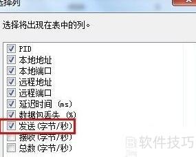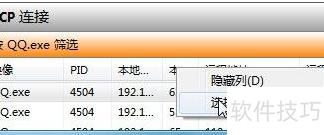 在进行QQ.exe网络活动时,您会在TCP连接区域看到程序的详细连接信息。为了找到正确的QQ进程,请在列表中右键点击列标题,选择选择列。这将帮助您进一步查看和区分各连接的具体属性,从而精确定位目标QQ进程。