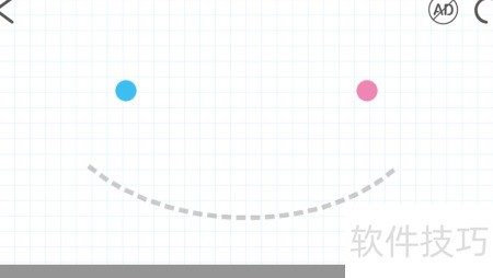1、 在Brain Dots游戏中,每关需自由绘制线条,巧妙引导红球与蓝球相撞以过关。挑战第一关时,可画一条弧线,如示意图所示,促使两球碰撞,顺利通过。
