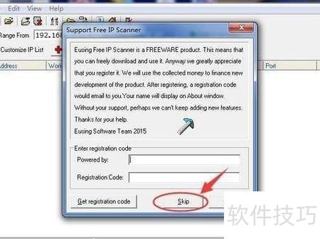 运行Free IP Scanner时,请先输入注册码,只需单击跳过按钮,这款软件为你提供全面的扫描服务,完全免费且无须额外费用。
