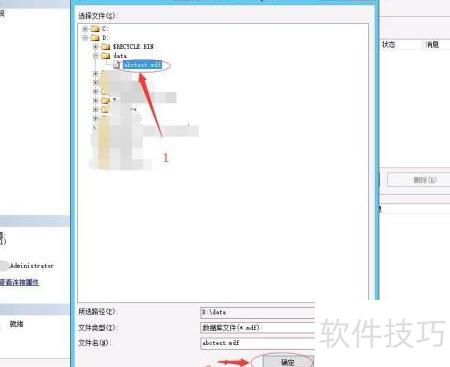 点击“打开”图标启动定位数据库文件。 在文件选择区域找到D:data目录。 选取abctest.mdf文件,确保准确无误。 确认之后,点击“确定”按钮。 完成后,操作已完成。