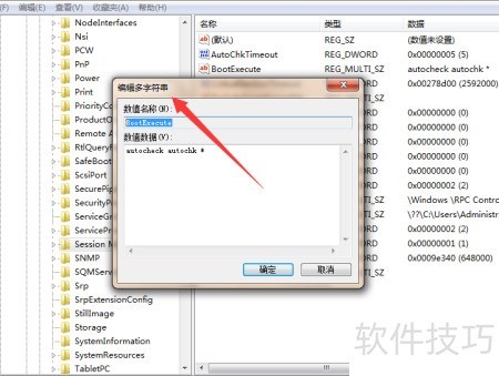 - 第五步,于右侧列表定位BootExecute,双击进入多字符串编辑界面。