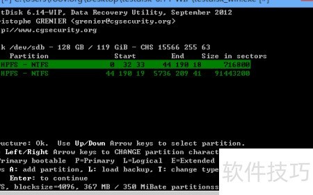 第六步:按下回车确认搜索结果,使用方向键选择分区类型。在Windows系统中,推荐的分区格式是NTFS。检查结果无误后,无需进一步调整。