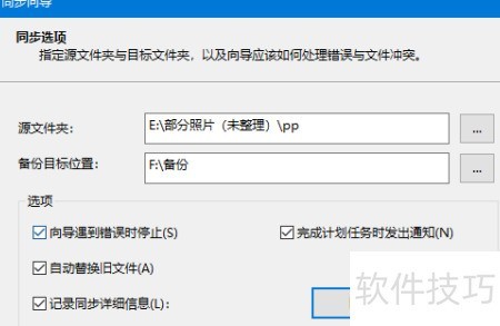 - 选择源文件夹与目标文件夹,勾选替换旧文件及完成通知,确保备份设置准确无误。