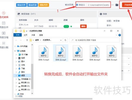 第三步:首先设定输出目录,供MP频文件存储;然后点击红色按钮启动转换,转换完成后自动打开输出文件夹,其中已保存的MP频文件供查看和使用。