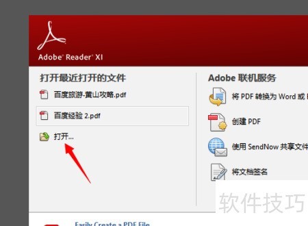 启动Adobe Reader软件后,界面出现空白。点击打开按钮,选择并导入PDF文件,操作步骤清晰易懂,便于快速查看文档内容。