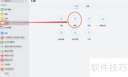 - 进入企业微信,点击工作台中的汇报功能,选择周报即可。