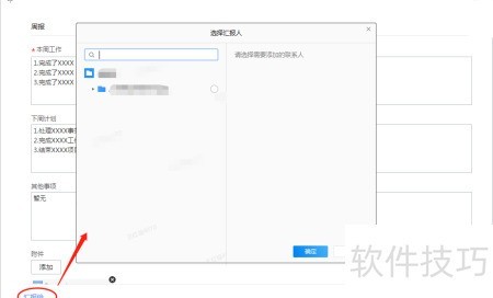 - 完成周报后,从组织架构中选择或直接输入需汇报的人员。