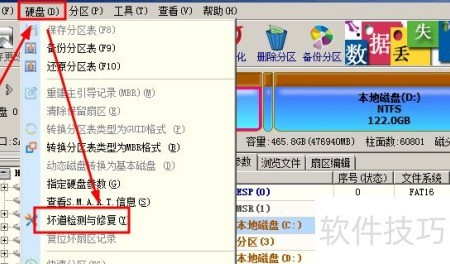 - 进入软件的硬盘菜单,选择坏道检测与修复功能并执行。