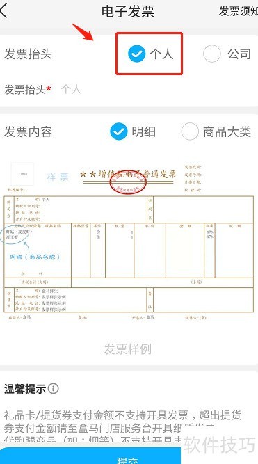 - 在电子发票页面,选择发票抬头为个人即可开具个人名称的电子发票。