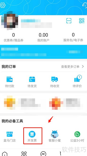 - 打开手机盒马App,登录后进入我的页面,找到我的必备工具,点击开发票即可。