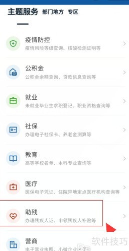 - 向下滚动页面,找到主题服务并点击其中的助残选项。