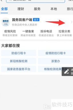 - 打开支付宝,在顶部搜索栏输入国务院客户端进行搜索。