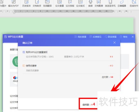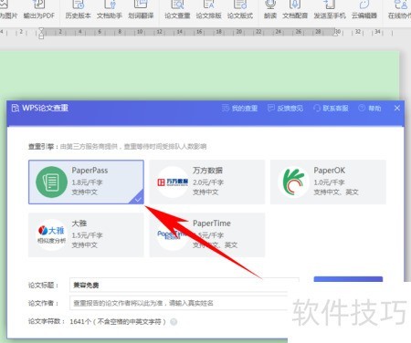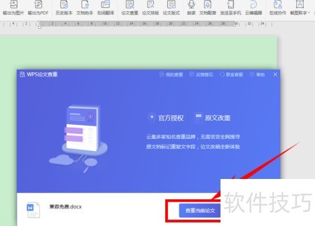 点击查重后,弹出WPS论文查重窗口,下方列出待检测文件名,可选择查重当前论文或从电脑中选取其他论文进行检测。