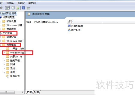 - 在用户配置的管理模板中,找到Windows组件选项进行设置。
