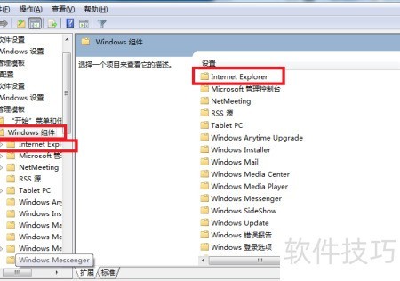 在 Windows 组件下拉菜单中选择 Internet Explorer,或在右侧界面中直接选中即可完成设置。