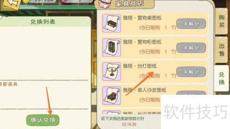 - 进入家具店,点击右侧兑换选项,选择雅居-台灯并确认,即可成功获取该物品。