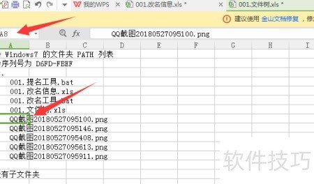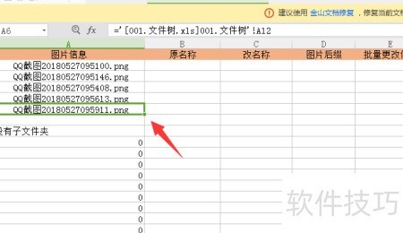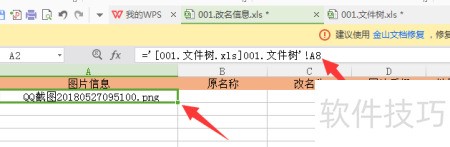 - 在A2单元格中输入公式=001.文件树!A8,以引用001.文件树工作表中A8单元格的内容。
