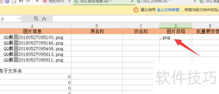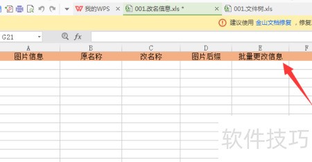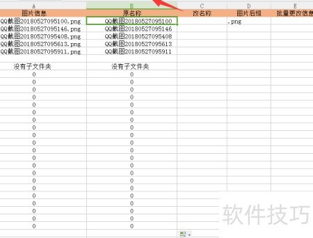 打开“改名信息.xlsx”文件,按照指示创建五个列:图片信息、原始名称、新名称、后缀以及批量处理说明。