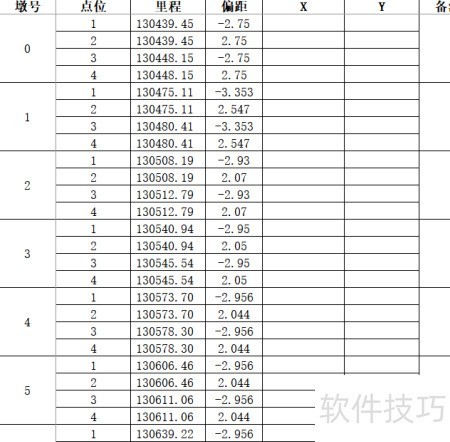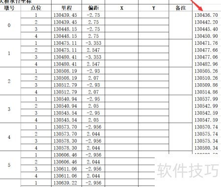 - 在坐标前新增一列,用于计算里程和偏距的总和。