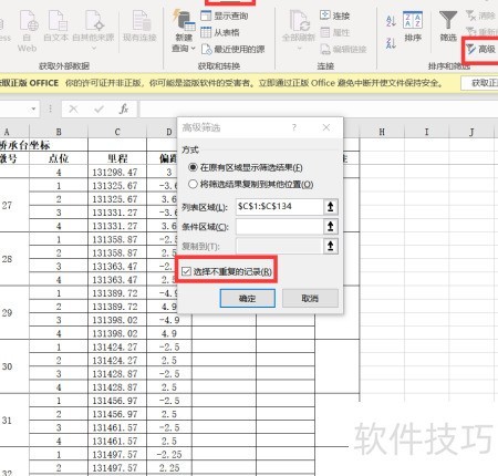 在Excel中处理里程与偏距时,先选中里程列,点击“数据”>“高级筛选”,勾选“选择不重复记录”选项,提取出唯一里程数据。