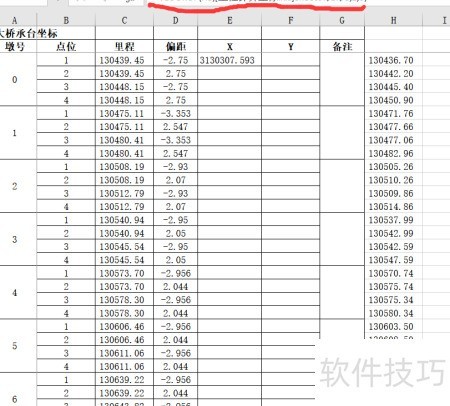 在Excel中打开并选择需要计算坐标的文件,例如,一个拥有支墩的桥梁。手动操作十分费时,引入高效方法会大大节省时间。