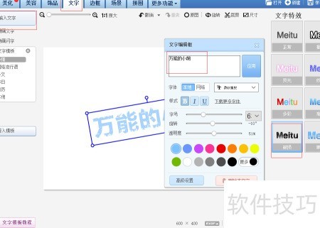 - 建议输入文字后,适当调整角度与透明度以优化效果。