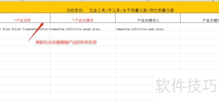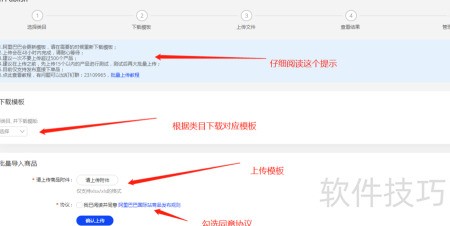 - 进入批量上传页面后,按提示操作,先下载所属类目的模板文件。