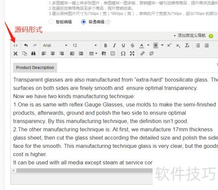 产品详情产品详情请使用普通的编辑模式,并将代码或文本内容直接输入其中。方法如下:点击页面上的“<”和“>”按钮,可进入编辑模式并手动填写。此格式适用于源码或纯文本格式的产品信息描述。