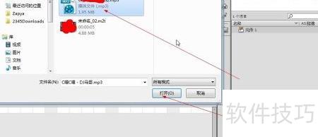 如下图所示,在弹出的文件选择窗口中,选择任意一首MP式的音乐文件(仅为演示目的,无需考虑歌曲内容),然后点击箭头所指的“打开”按钮,即可成功将该音乐文件导入到音乐库中。