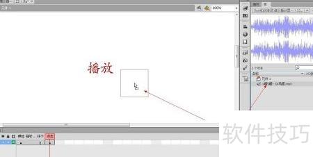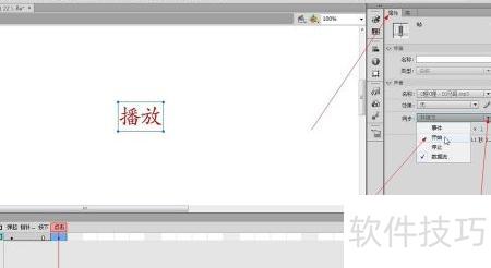 如图所示,选中并点击一个帧,然后打开其属性面板,点击面板中指向的黑色三角按钮,从下拉菜单中选择“开始”,即可在鼠标点击该帧时播放音乐效果。