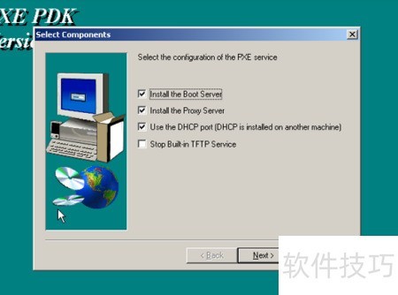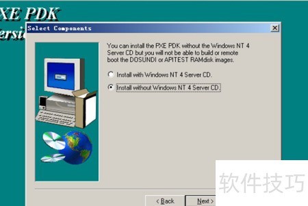 - 在安装目录中,启动 pxepdk.exe,按默认选项进行安装。当到达选择组件界面时,选择不使用 Windows NT服务器光盘的选项,继续后续步骤。