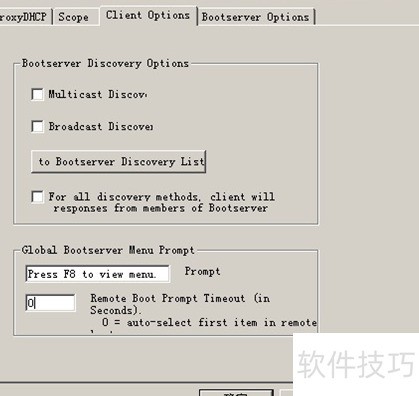 在Client Option选项卡中取消勾选Broadcast Discover,然后在Remote Boot Prompt Timeout设置为确保无盘工作站启动时不显示任何菜单界面。