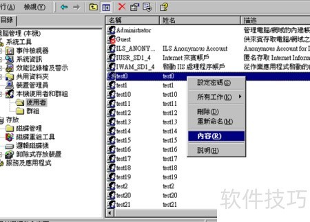 - 创建用户后,右键点击用户名(如test0),选择属性即可。