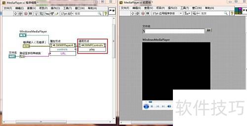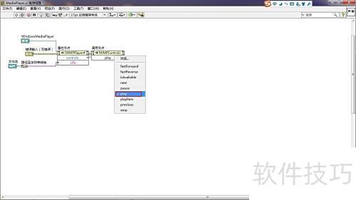 继续为程序添加调用节点,通过“菜单”>“函数面板”,切换至“编程”>“应用程序控制”,选定调用节点,将IWMPlayer“outputs”端口与之相连,在此节点内选中“play”方法即可。