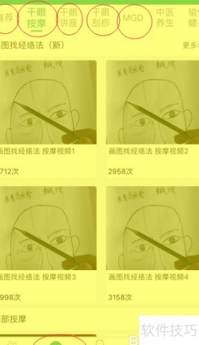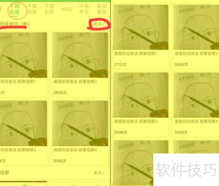 以观看干眼症按摩视频中的经络定位方法为例,进入发现页面选择干眼按摩,即可看到画图找经络法(新)。点击右上角更多,展开后可发现该方法按顺序排列,具体顺序所示。