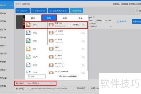- 点击输出格式,选择视频,找到mp4同源文件并点击确认。