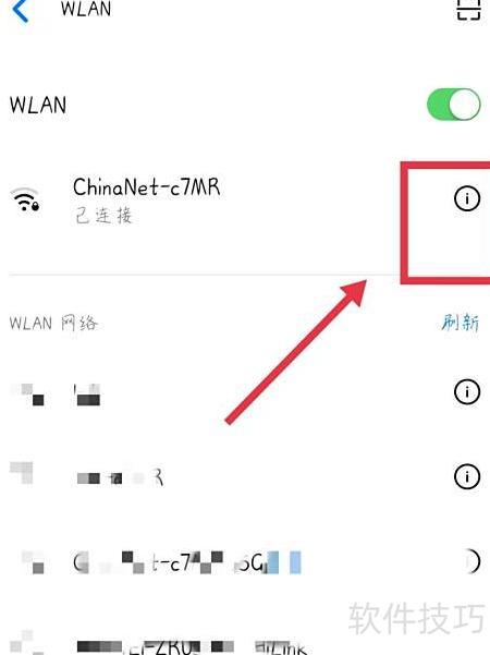 - 找到已连接的网络,点击Wi-Fi名称后的感叹号,进入设置页面进行调整。