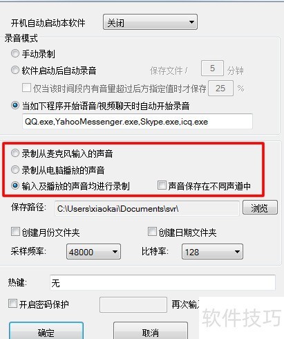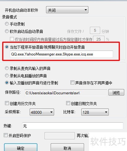 转至文件菜单,选择设置选项。如果你想让软件在视频会议启动时自动开始录音,在语音/视频聊天过程中自动启动,并在会后自动关闭,可以在“语音/视频聊天时自动开始录音”这一栏中输入所使用的视频会议工具的进程名称。例如,如果你使用的是常见的QQ、Yahoo通、Skype或ICQ进行音视频通话,系统将会自动开启录音功能。此外,你还可以通过主界面中的开始和停止按钮随时控制录音的启停操作,非常灵活便捷,能满足不同场景下的录音需求。