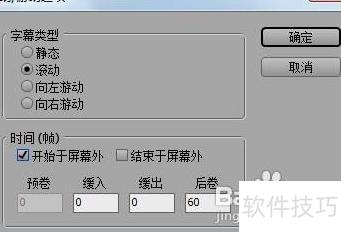 点击新建字幕按钮,打开设置界面。 选择字幕滚动模式和起始位置(内屏/外屏)。 在“预设”选项中勾选左键确认功能,然后设定字幕卷数为 最后点击确定以完成配置。