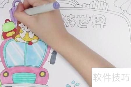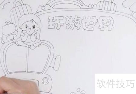 - 在左下角画一辆汽车,象征环游世界所需的交通工具。