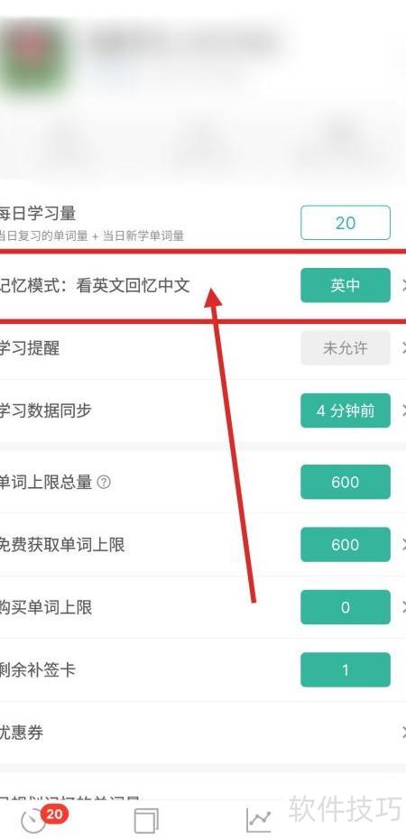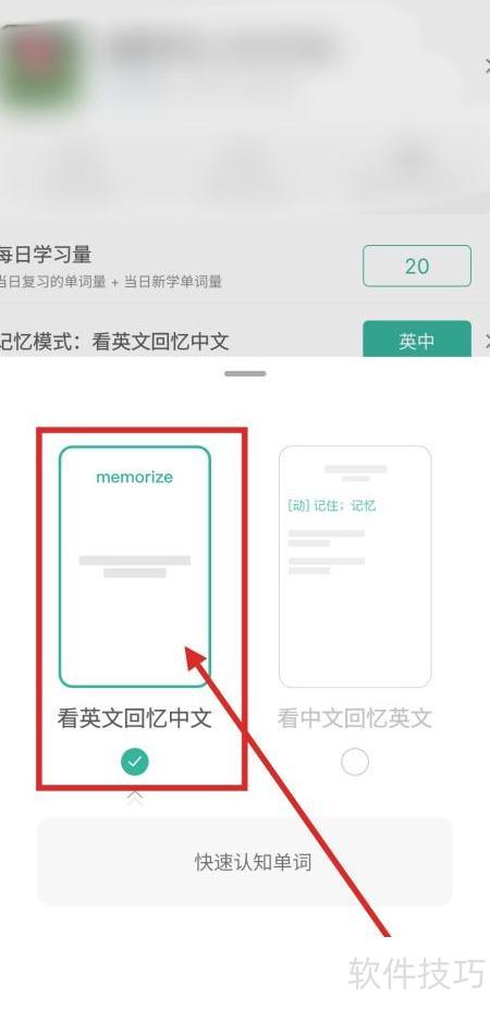 - 勾选看英文回忆中文并确认,完成记忆模式设置。